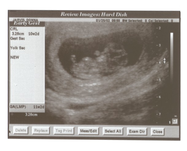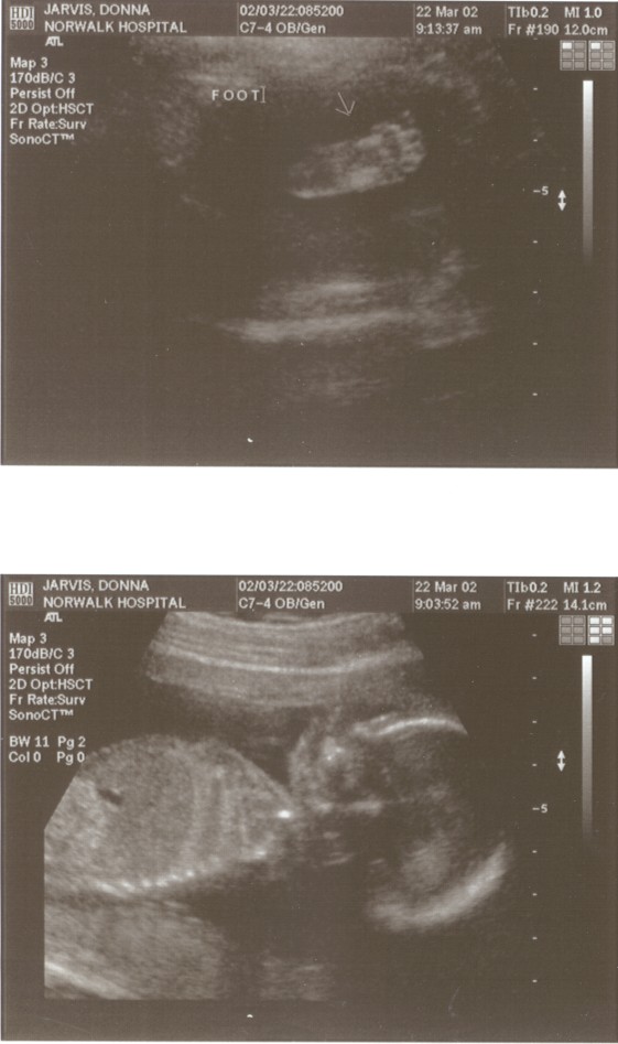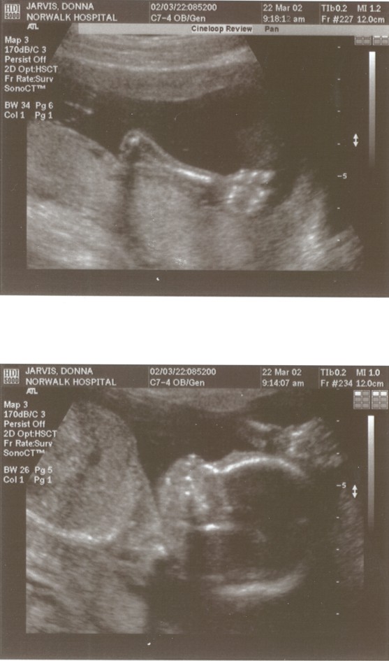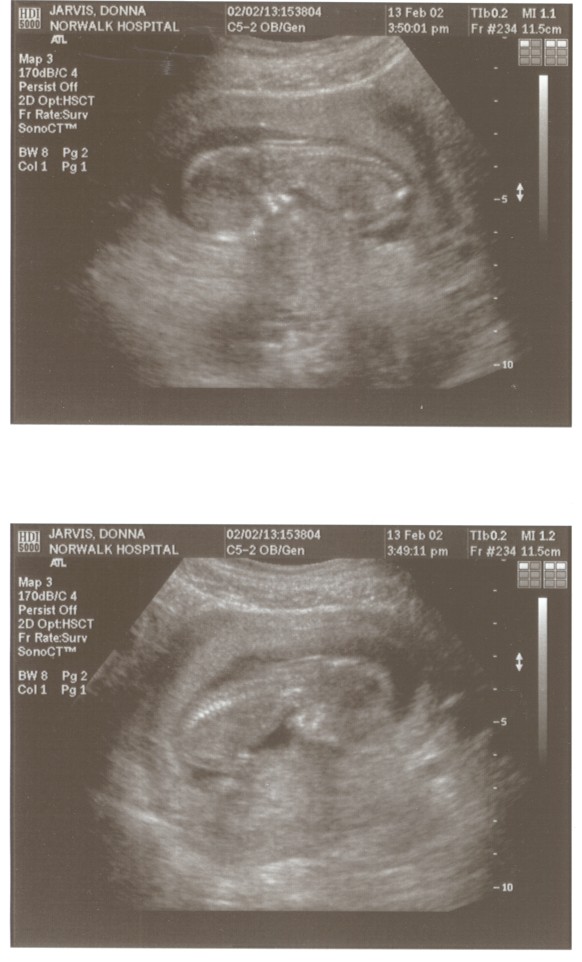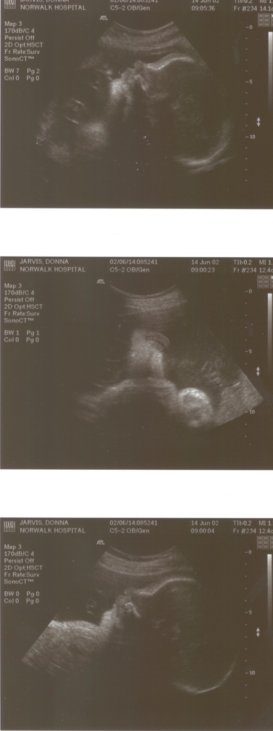6/15/02 (Week 32)- We had our last ultrasound this week. The baby appears in good health and is estimated at 3 pounds, 14 ounces which is around the median size. We saw her lips and her tongue and watched her yawn. We also saw her little heart beating and watched her kick. Mom, however, is getting more and more uncomfortable - back aches, feet hurt, hands, feet and legs swollen. And she gained a little too much weight this visit, so we are now watching what we eat. We picked out our baby announcements this week and the room will finally be painted next week, so we are making some progress on getting everything done before the baby arrives!